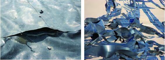 土工膜在運輸、安裝和運行過程中會產生破損,破損的土工膜造成防滲系統失效,產生環境污染事件。采用回料生產的土工膜質量差,被大量應用于垃圾填埋場,對填埋場的安全運行帶來巨大隱患。
